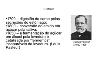 O documento discute o histórico e propriedades das enzimas. Ele descreve as descobertas iniciais sobre enzimas na digestão e fermentação entre 1700-1850, e o isolamento e cristalização da primeira enzima em 1926. Também explica que as enzimas são tipicamente proteínas, afetam a velocidade e não o equilíbrio de reações, e catalisam reações por meio de interações fracas com substratos.