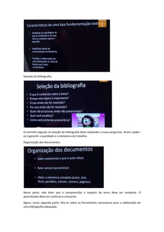 Esta aula discute como encontrar e utilizar a teoria para fundamentar um projeto de pesquisa, incluindo como interagir com textos clássicos e recentes e obter recomendações do orientador sobre autores e livros importantes. Também aborda a seleção e organização da bibliografia usando perguntas-chave e ferramentas como periódicos científicos e portais de busca para encontrar informações confiáveis.