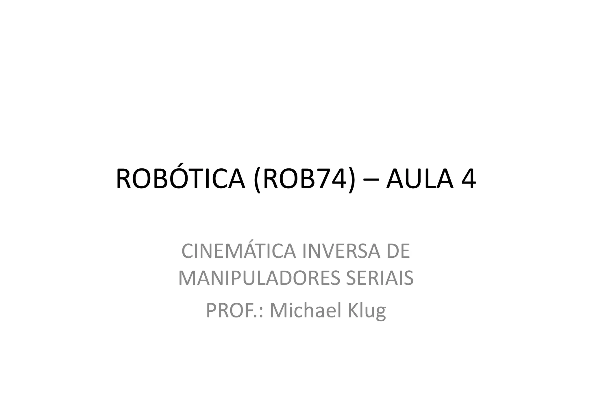 A aula aborda a cinemática inversa de manipuladores seriais, que determina os valores das juntas para uma configuração no espaço operacional. A cinemática inversa nem sempre tem solução analítica e pode haver múltiplas soluções ou degeneração. Exemplos incluem cinemática inversa de manipuladores planares RR e situações de redundância cinemática.