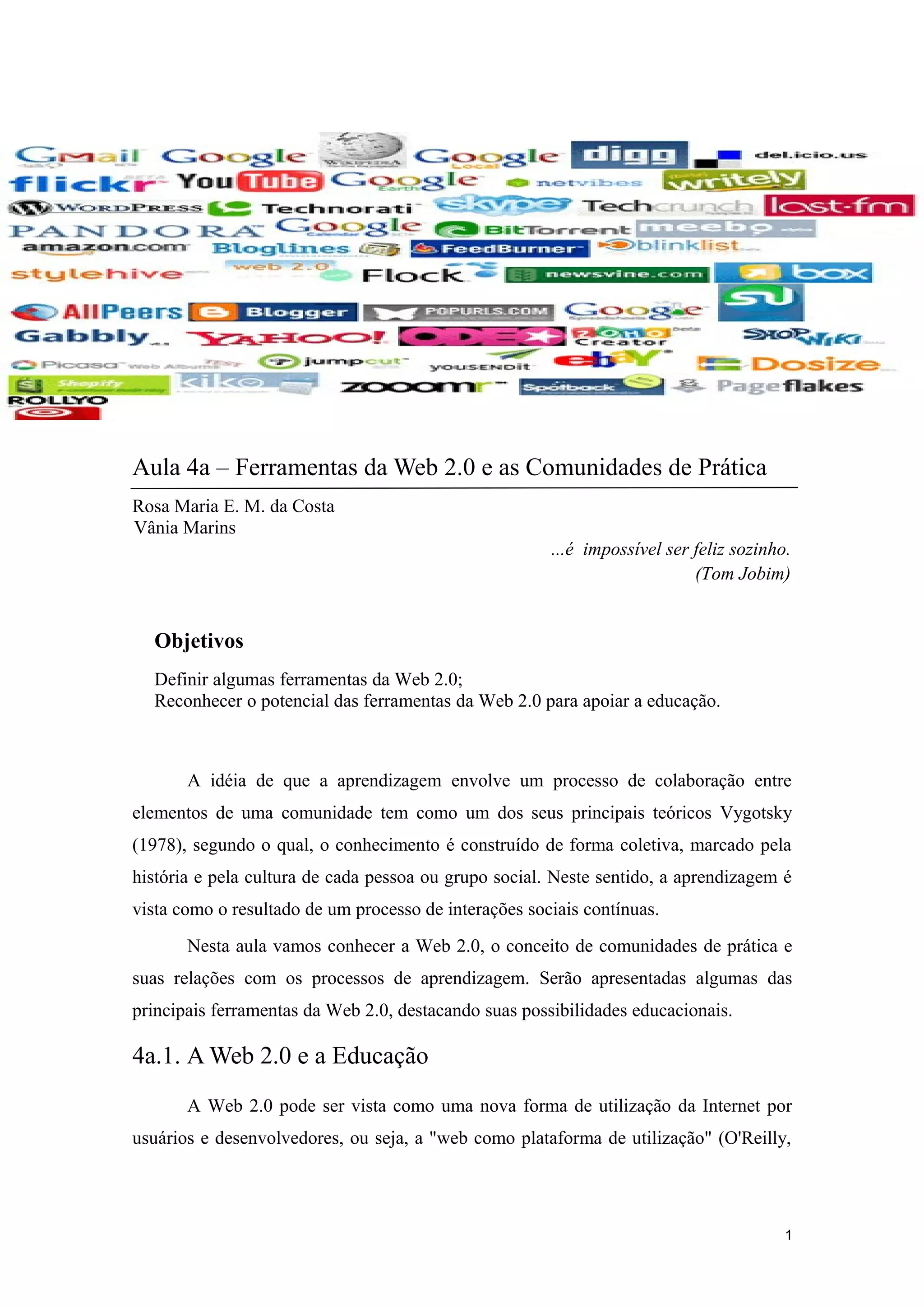 O documento discute o potencial das ferramentas da Web 2.0 para apoiar a educação e comunidades de prática. Apresenta conceitos como Web 2.0, mídia social e comunidades de prática, e exemplos de ferramentas como blogs, wikis, redes sociais que podem ser usadas para compartilhamento e construção colaborativa de conhecimento.