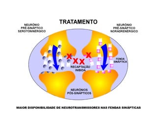 O documento descreve os processos de comunicação entre neurônios através de sinapses químicas e elétricas. A transmissão de sinais ocorre por potenciais de ação e liberação de neurotransmissores nas sinapses, que podem ser excitatórios ou inibitórios. Doenças como Alzheimer, Parkinson e esquizofrenia estão relacionadas a desequilíbrios nos sistemas colinérgico, dopaminérgico e outros.