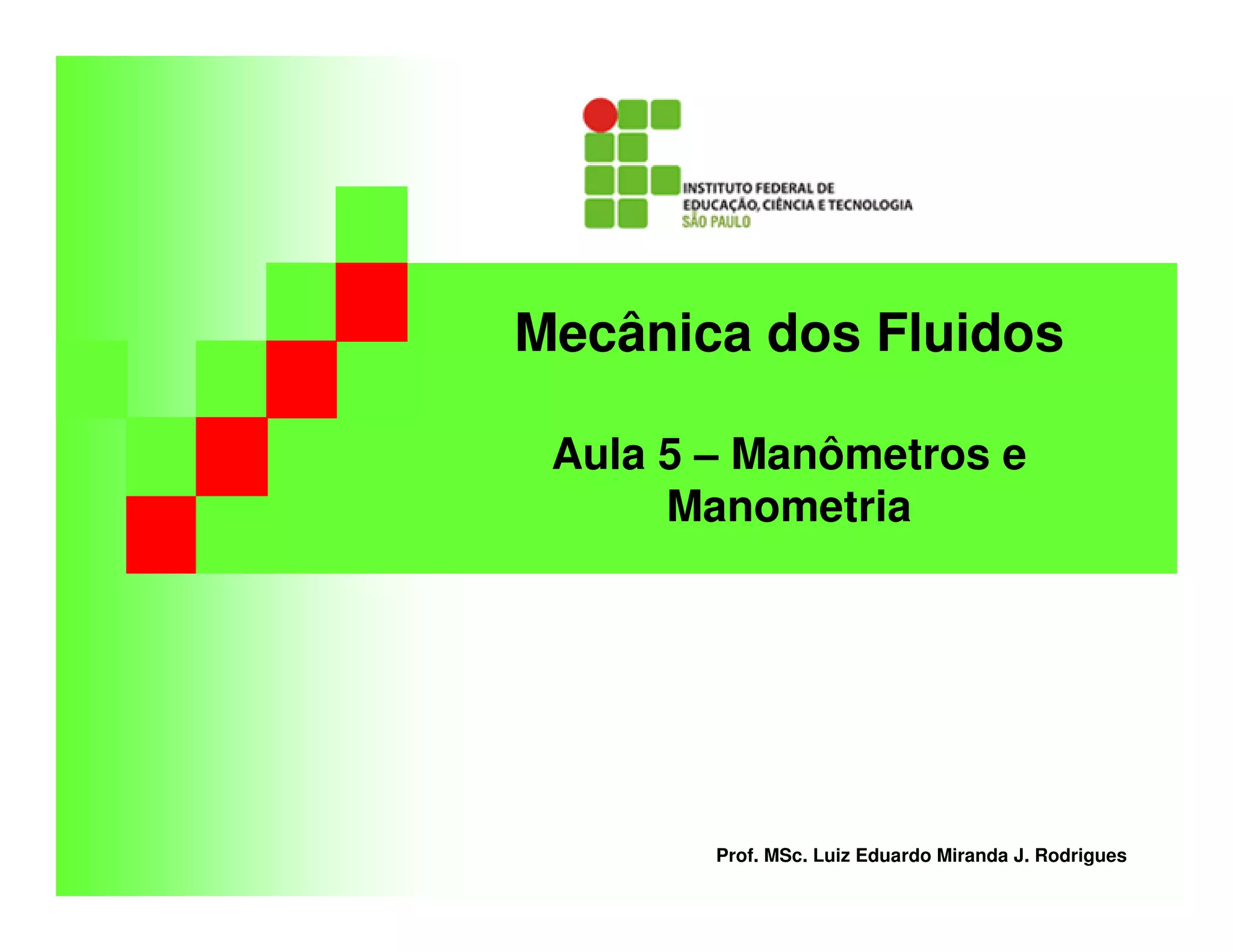 O documento apresenta um resumo da aula 5 sobre manômetros e manometria ministrada pelo professor Luiz Eduardo Miranda J. Rodrigues. São definidos manômetros e seus principais tipos como manômetros utilitários, industriais, herméticos, de aço inoxidável e petroquímicos. Explica também a determinação da pressão por meio do teorema de Stevin e apresenta exercícios sobre o tema.