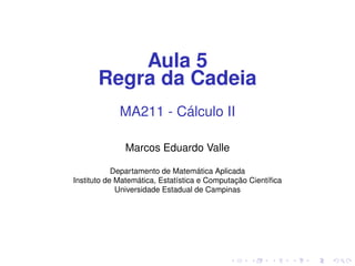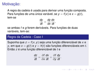 A aula apresenta a regra da cadeia para derivar funções compostas de uma ou mais variáveis. A regra é generalizada para funções de várias variáveis intermediárias e variáveis independentes. Exemplos ilustram o cálculo de derivadas parciais usando a regra da cadeia.
