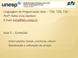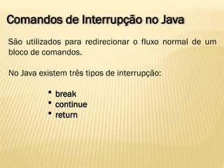 O documento aborda conceitos de interrupções em Java, como break, continue e return, bem como a declaração e utilização de arrays unidimensionais e multidimensionais. Exemplos práticos são fornecidos para demonstrar a declaração de arrays, indexação e como manipular dados neles. Também são apresentados exercícios para praticar a implementação desses conceitos em programação.