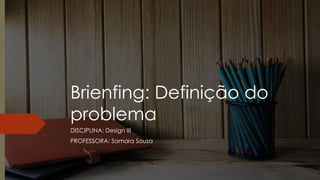 O documento aborda a definição e a importância do briefing no design, enfatizando sua função de reunir e organizar informações essenciais para o desenvolvimento de projetos criativos. Também apresenta técnicas de elaboração de um briefing eficaz, destacando a necessidade de um diálogo contínuo entre a equipe e a inspiração criativa. Por fim, discute regras para evitar erros comuns na criação de briefings, como a formalidade excessiva e a falta de foco.