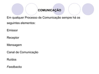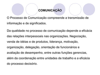 O documento discute o processo de comunicação, incluindo os elementos essenciais como emissor, receptor, mensagem, canal de comunicação e ruídos. Também aborda os tipos de comunicação como oral e escrita, além de competências importantes para emissores e receptores.