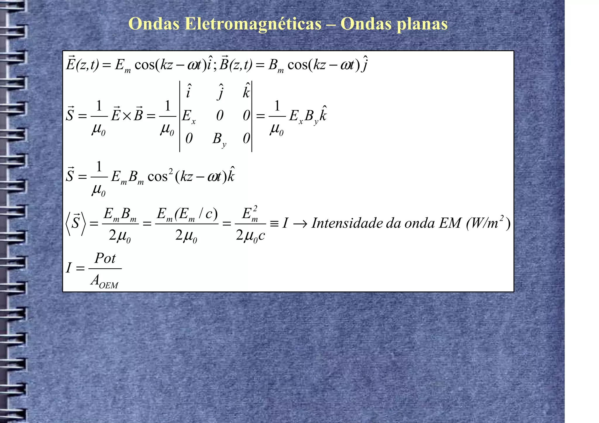 Este documento descreve ondas eletromagnéticas planas propagando-se em uma direção. Ele fornece expressões para os campos elétrico e magnético e intensidade da onda. Também apresenta dois exercícios resolvidos sobre ondas eletromagnéticas.