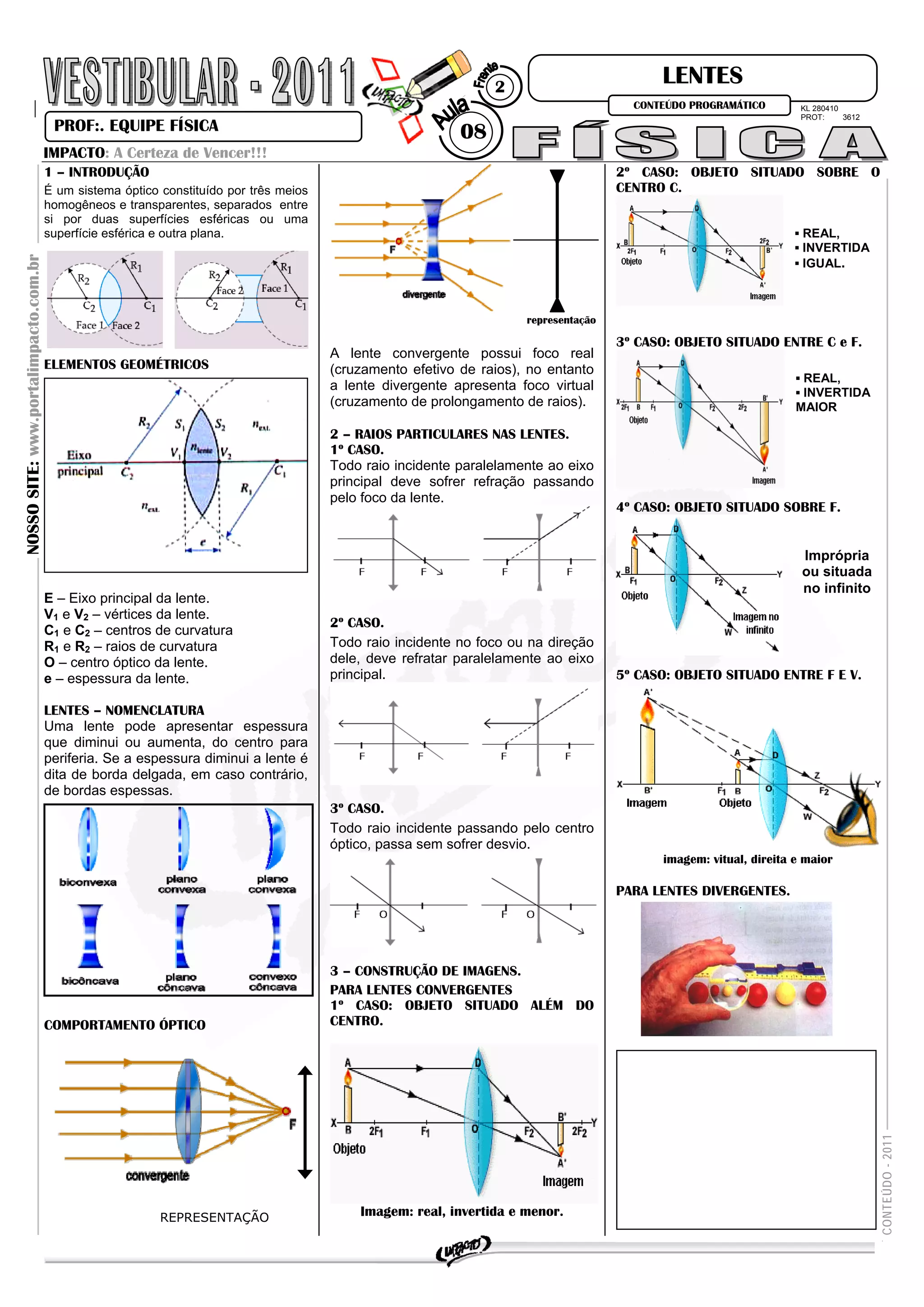 1. O documento discute as propriedades e comportamento de lentes, incluindo elementos geométricos, nomenclatura, raios particulares e construção de imagens para lentes convergentes e divergentes.