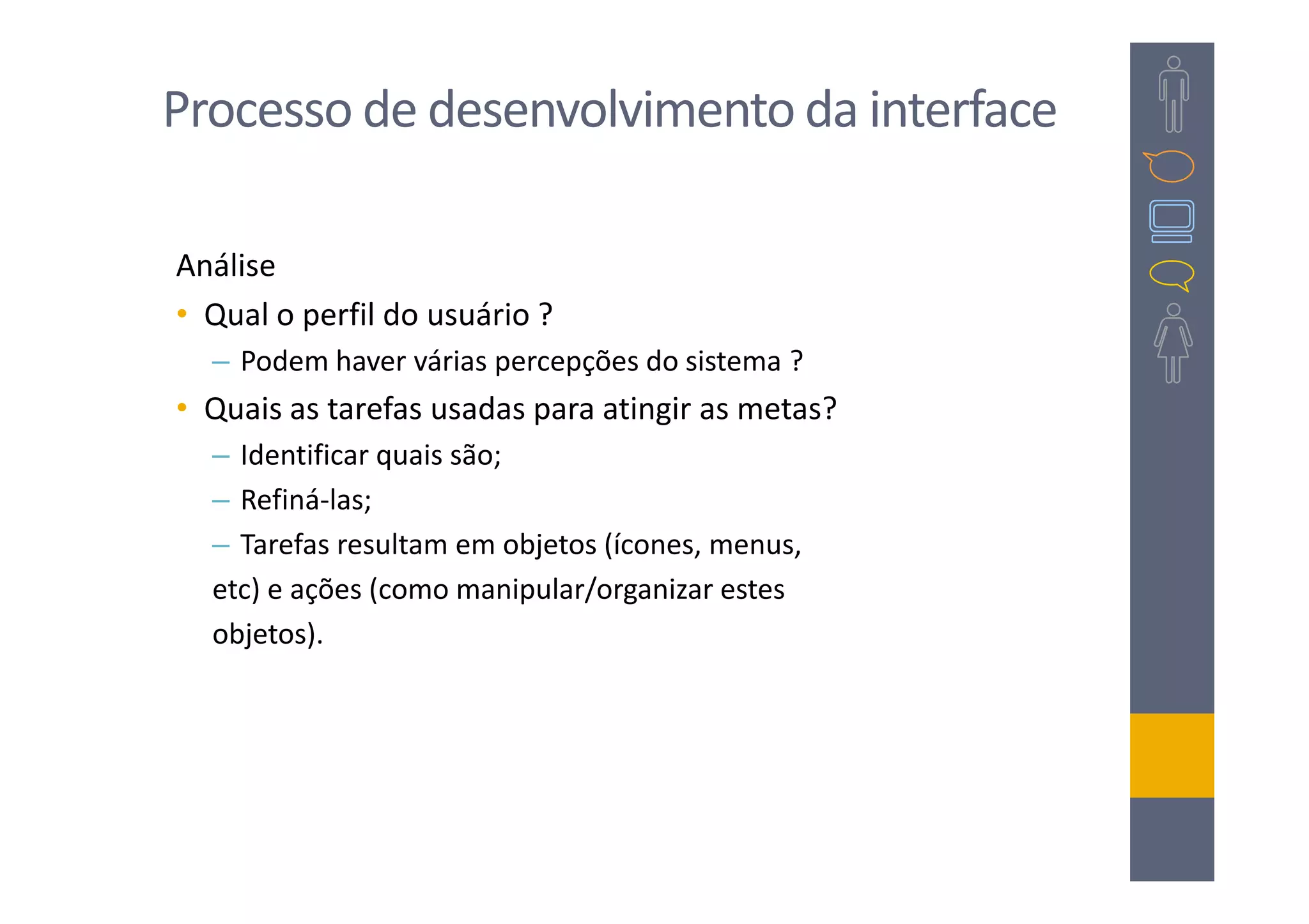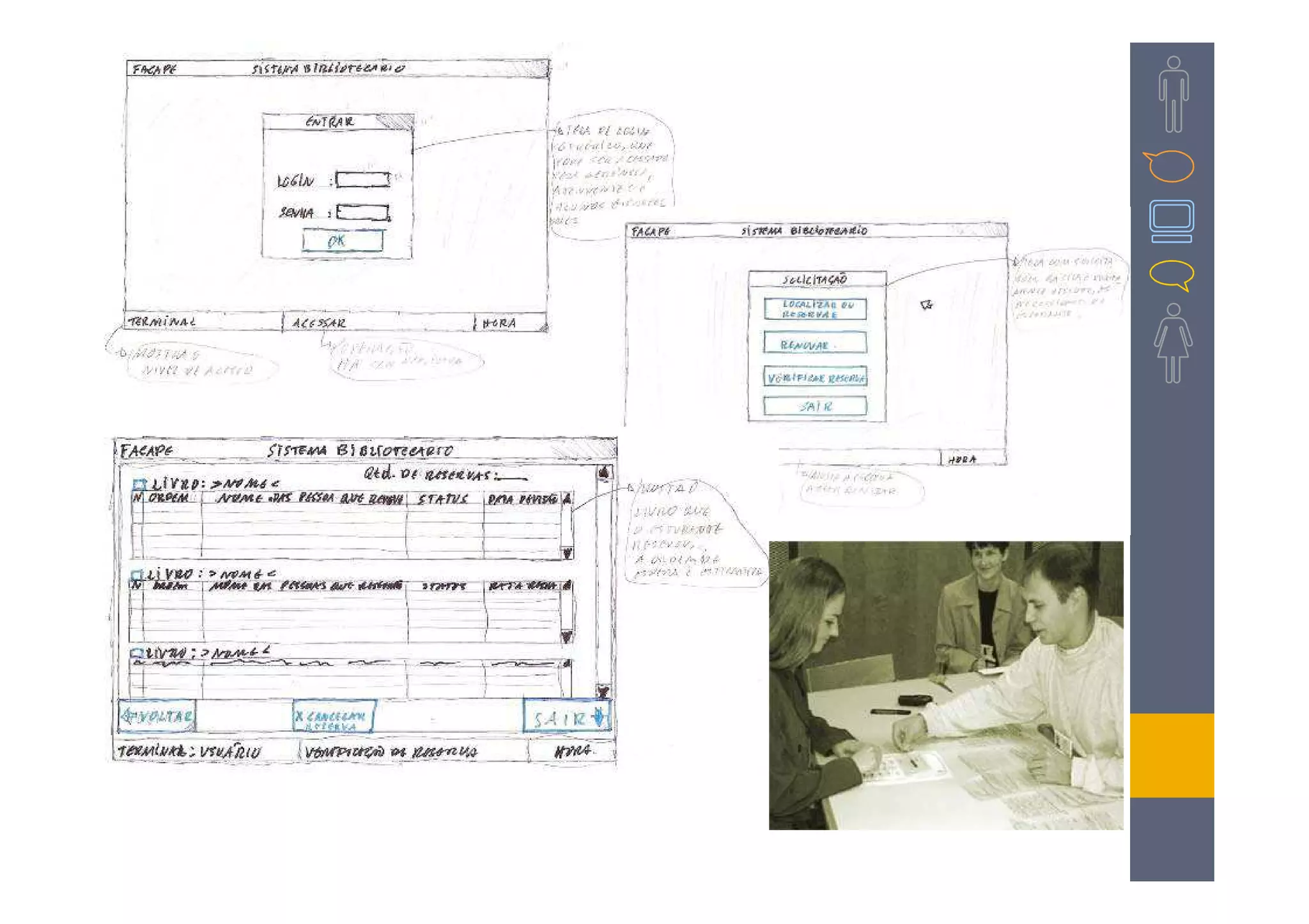 O documento descreve o processo de desenvolvimento de interfaces, incluindo análise de usuários, projeto, prototipagem e avaliação. Discute tipos de protótipos como de baixa e alta fidelidade e apresenta exemplos. Também aborda conceitos como personas, cenários e guias para projeto de interface.