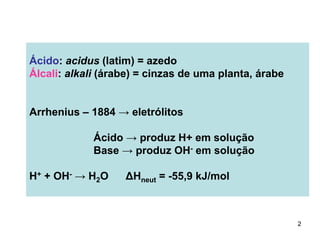 1) Ácidos e bases podem ser definidos segundo as teorias de Arrhenius e Lowry-Bronsted. Arrhenius define ácidos como substâncias que produzem íons H+ em solução e bases como substâncias que produzem íons OH-. Lowry-Bronsted define ácidos e bases como substâncias capazes de doar ou receber prótons.