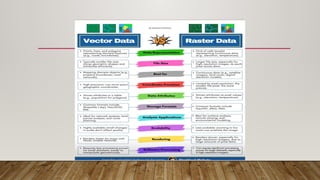 O documento discute a composição e os componentes dos Sistemas de Informação Geográfica (SIG), destacando suas partes essenciais: hardware, software, dados, pessoas e métodos. Os tipos de dados em SIG incluem informações geométricas como raster e vetor, além de atributos que descrevem as feições. O texto também aborda as fontes de dados que alimentam os SIG, diferenciando entre dados primários e secundários.