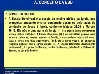 (1) O documento discute os conceitos e história da educação bíblica dominical. (2) Ao longo da história, Deus ordenou que Seu povo ensinasse Suas palavras, seja aos filhos ou à comunidade. (3) Jesus foi o grande mestre e ordenou que Seus discípulos ensinassem a todos após Sua ascensão.