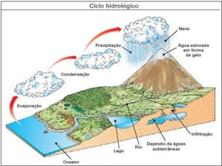 O documento descreve as principais características hidrográficas do Brasil. A hidrografia brasileira é rica em rios perenes alimentados principalmente por chuvas, com a maioria apresentando regime de cheias no verão. As principais bacias hidrográficas são a Amazônica, a do Platina e a do São Francisco, que são muito utilizadas para geração de energia hidrelétrica e navegação.