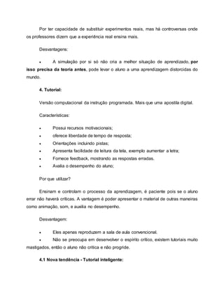 O documento discute os tipos de software educativo, incluindo simulações, tutoriais e linguagens de programação. Simulações podem ser estáticas ou interativas e fornecem experiências seguras para estudantes. Tutorials guiam o processo de aprendizagem de forma paciente, embora possam não desenvolver o pensamento crítico. Linguagens de programação como o Logo ajudam a representar problemas matemáticos.