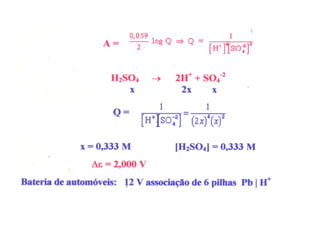 O documento discute o potencial de pilhas, definindo força eletromotriz (f.e.m) como a força que move os elétrons em uma pilha, medida em volts. Explica que a f.e.m depende da natureza das reações químicas, concentração das espécies e temperatura. Também define potencial padrão de pilha como a f.e.m quando as condições são concentração de 1M, pressão de 1 atm e temperatura de 25°C.