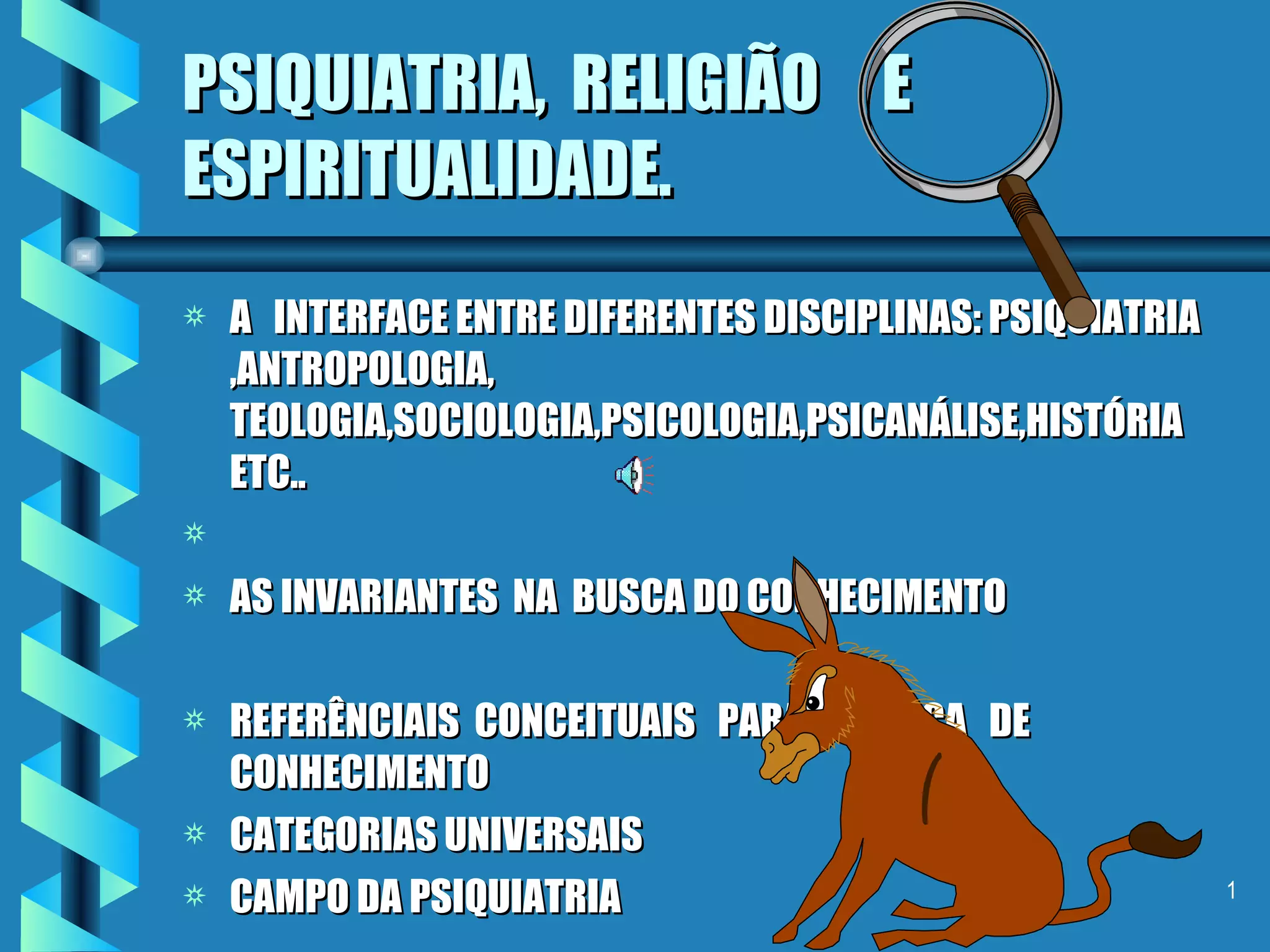 O documento discute a interface entre psiquiatria, religião e espiritualidade, abordando conceitos como sagrado, profano e inconsciente coletivo. Também apresenta exemplos clínicos ilustrando como fantasias e conflitos podem estar ligados a questões religiosas e espirituais.