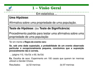 O capítulo 8 do livro de Triola aborda o teste de hipótese, um procedimento estatístico para testar afirmativas sobre características populacionais. Discute as hipóteses nula e alternativa, estatísticas de teste, níveis de significância e erros tipo I e II. O texto também apresenta diversos métodos para conduzir testes sobre proporções, médias e variâncias, fornecendo exemplos práticos e passos para as análises.