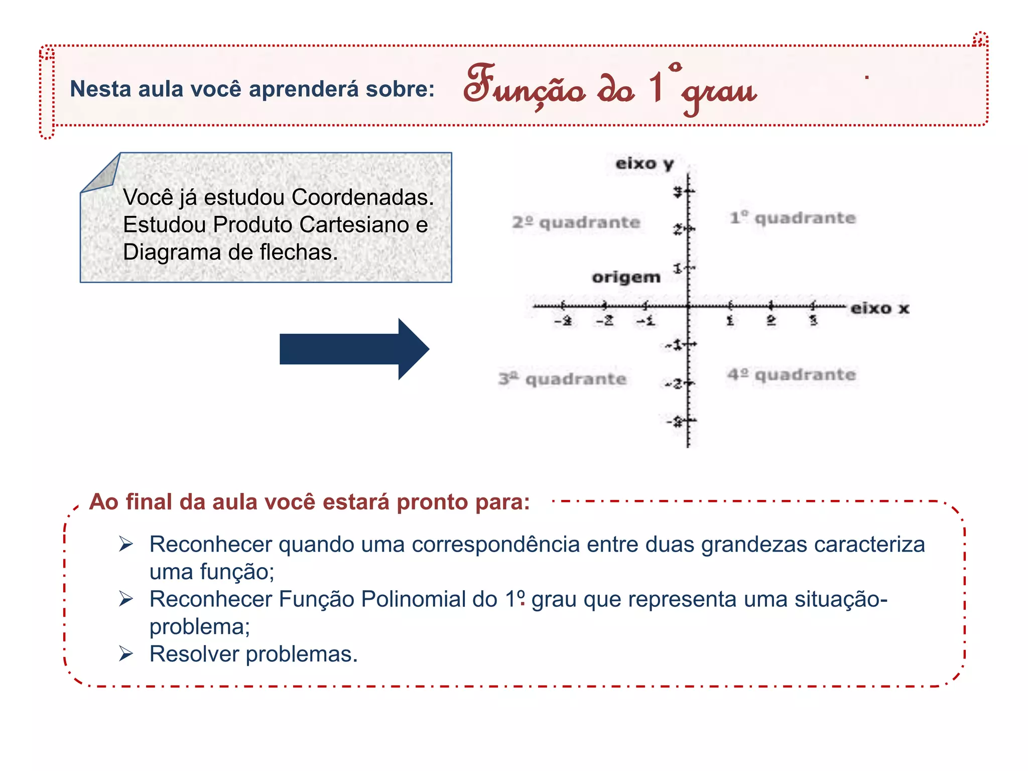 1) Reconhecer situações que caracterizam funções do 1o grau;