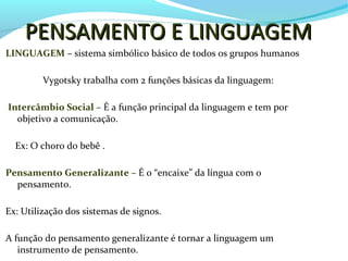 O documento discute a relação entre pensamento e linguagem segundo Vygotsky, enfatizando que essa interação é um processo sócio-histórico fundamental para o desenvolvimento humano. Destaca as funções principais da linguagem, como intercâmbio social e pensamento generalizante, e como a inserção cultural da criança impulsiona essa relação. Enfatiza que o significado das palavras é um ato de pensamento que evolui historicamente e continua a se transformar ao longo do desenvolvimento do indivíduo.