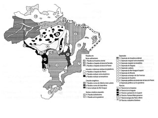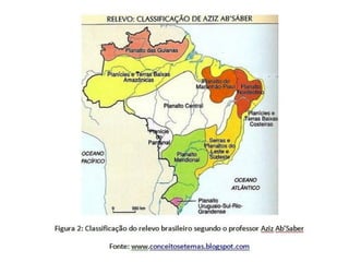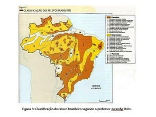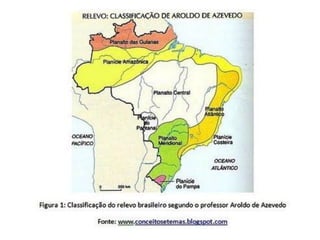 O documento discute os tipos de relevo no Brasil, classificando-os em planícies, planaltos e depressões de acordo com sua altitude e processos geológicos. Descreve as principais formações como a Planície Amazônica, o Planalto Atlântico e a Depressão do São Francisco, e explica como agentes internos e externos moldaram o relevo ao longo do tempo.