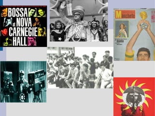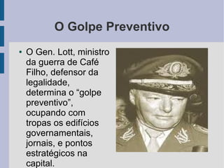 O documento descreve o período de 1954-1964 no Brasil, marcado por instabilidade política e golpes. Sob Juscelino Kubitschek (1956-1961), houve forte crescimento econômico através da industrialização, porém também aumento da inflação e da dívida externa. João Goulart (1961-1964) tentou implementar reformas populares, mas sofreu oposição dos militares e dos EUA no contexto da Guerra Fria, levando ao golpe de 1964.