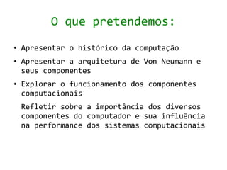 O documento apresenta os principais conceitos de computação, incluindo a história dos computadores desde o ábaco até as gerações modernas, a arquitetura de Von Neumann e seus componentes centrais, e explora o funcionamento de componentes como CPU, memória e entrada/saída.