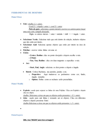 1) O documento apresenta atalhos e ferramentas do AutoCAD para desenho técnico, incluindo comandos de zoom, seleção, criação de linhas, círculos e arcos.
