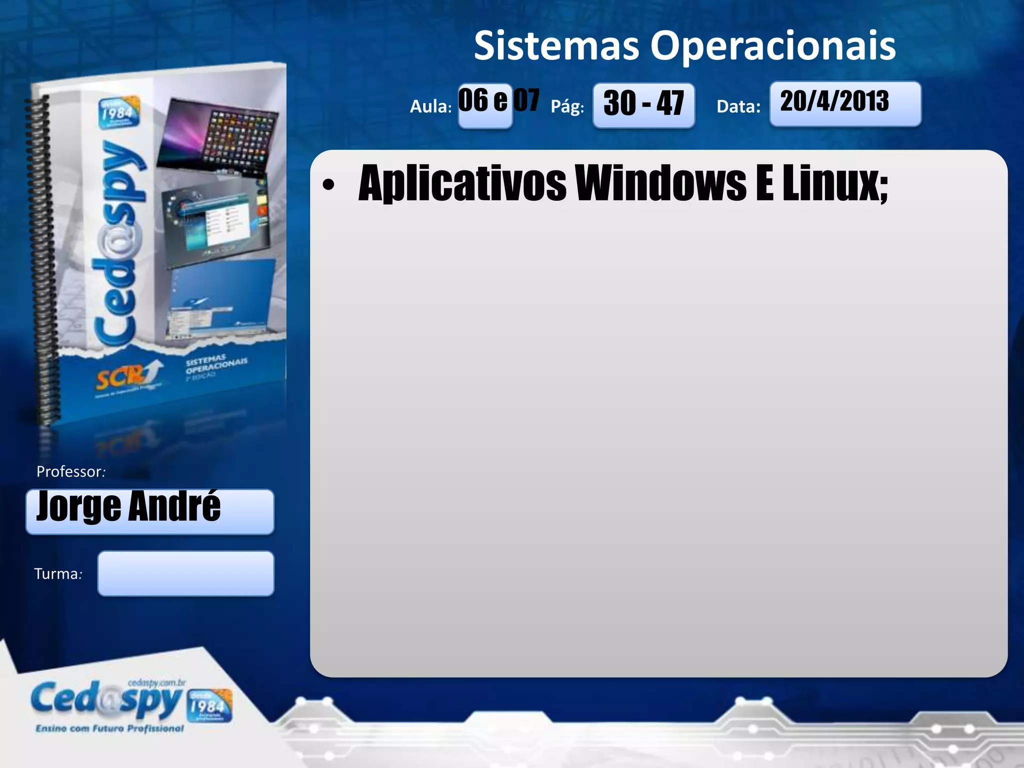 O documento discute aplicativos comuns no Windows e Linux, incluindo programas para desenho (Paint/KolourPaint), cálculo (Calculadora) e edição de texto (WordPad/Abiword), assim como navegadores da web (Internet Explorer/Firefox).