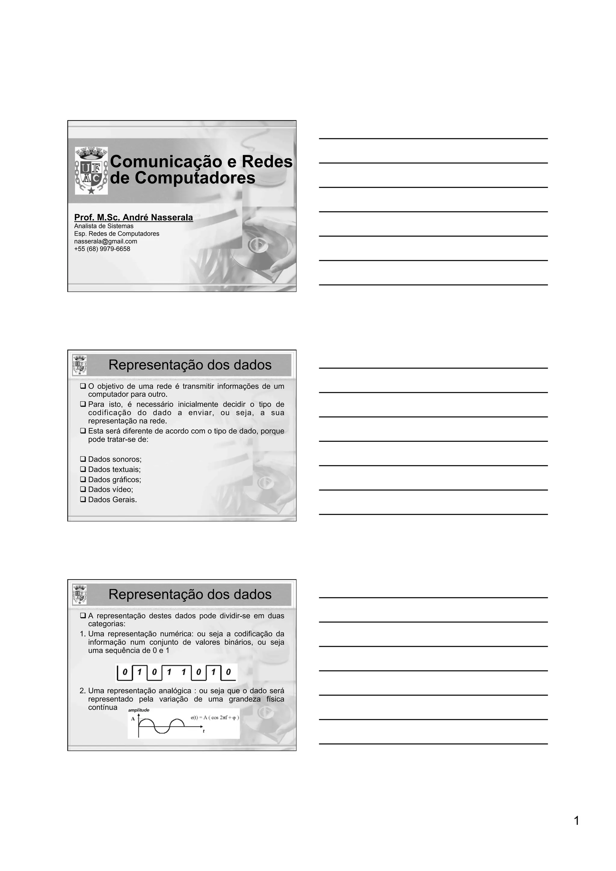 O documento discute diferentes aspectos da representação e transmissão de dados em redes de computadores, incluindo: 1) representações numéricas e analógicas de dados; 2) transmissão síncrona e assíncrona; e 3) modalidades de processamento como batch, on-line e em tempo real.