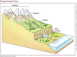 O documento descreve os principais tipos de relevo terrestre, incluindo montanhas, planaltos, planícies, depressões, inselbergues, chapadas, morros, coxilhas, serras, cuestas e falésias. Também apresenta exemplos de cada tipo de relevo encontrados no Brasil e no mundo.