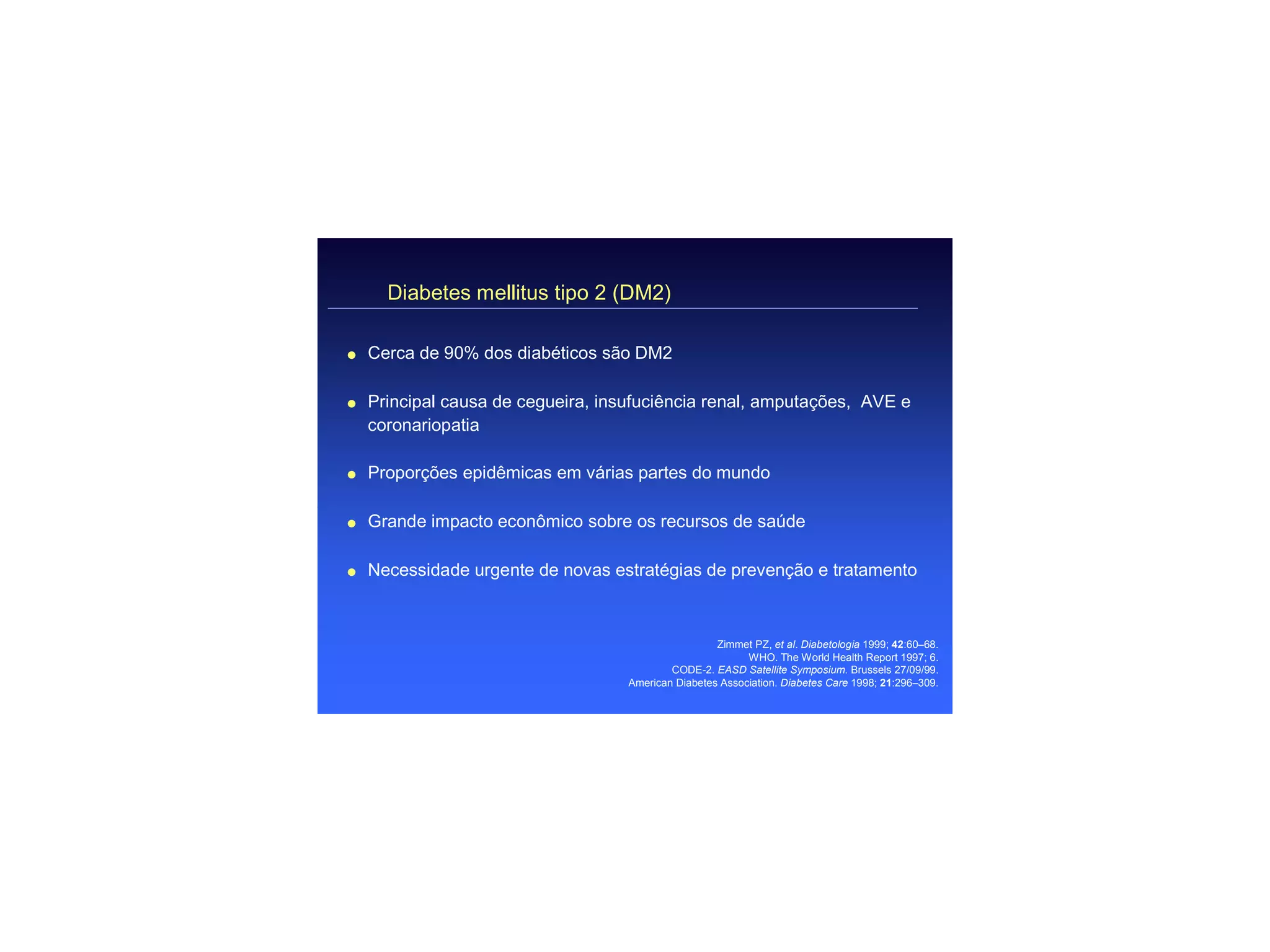 Diabetes mellitus tipo 2 é a forma mais comum de diabetes, afetando cerca de 90% dos diabéticos. É a principal causa de cegueira, insuficiência renal, amputações e doenças cardiovasculares. A prevalência global está aumentando e representa um grande impacto econômico para os sistemas de saúde. Novas estratégias de prevenção e tratamento são urgentes.