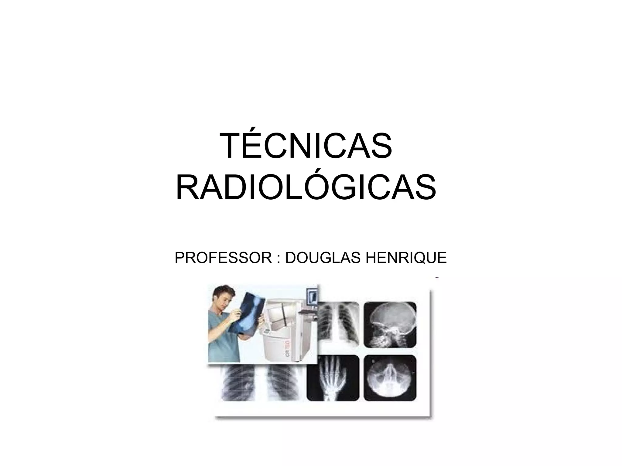 As principais técnicas radiológicas são exames convencionais, aparelhos portáteis, exames contrastados, mamografia, densitometria óssea, tomografia computadorizada, ressonância magnética, medicina nuclear, radioterapia e ultrassom, cada um com suas aplicações para diagnóstico e tratamento.