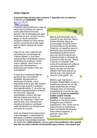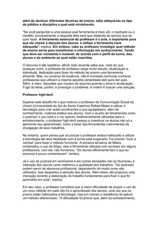 O documento discute estratégias para tornar as aulas mais interessantes, como o uso de tecnologias e atividades práticas fora da sala de aula. Um professor usa podcasts e redes sociais para envolver alunos, melhorando a qualidade dos trabalhos. Outro professor leva alunos de artes a museus e exposições para experiências práticas que não podem ser feitas em sala.