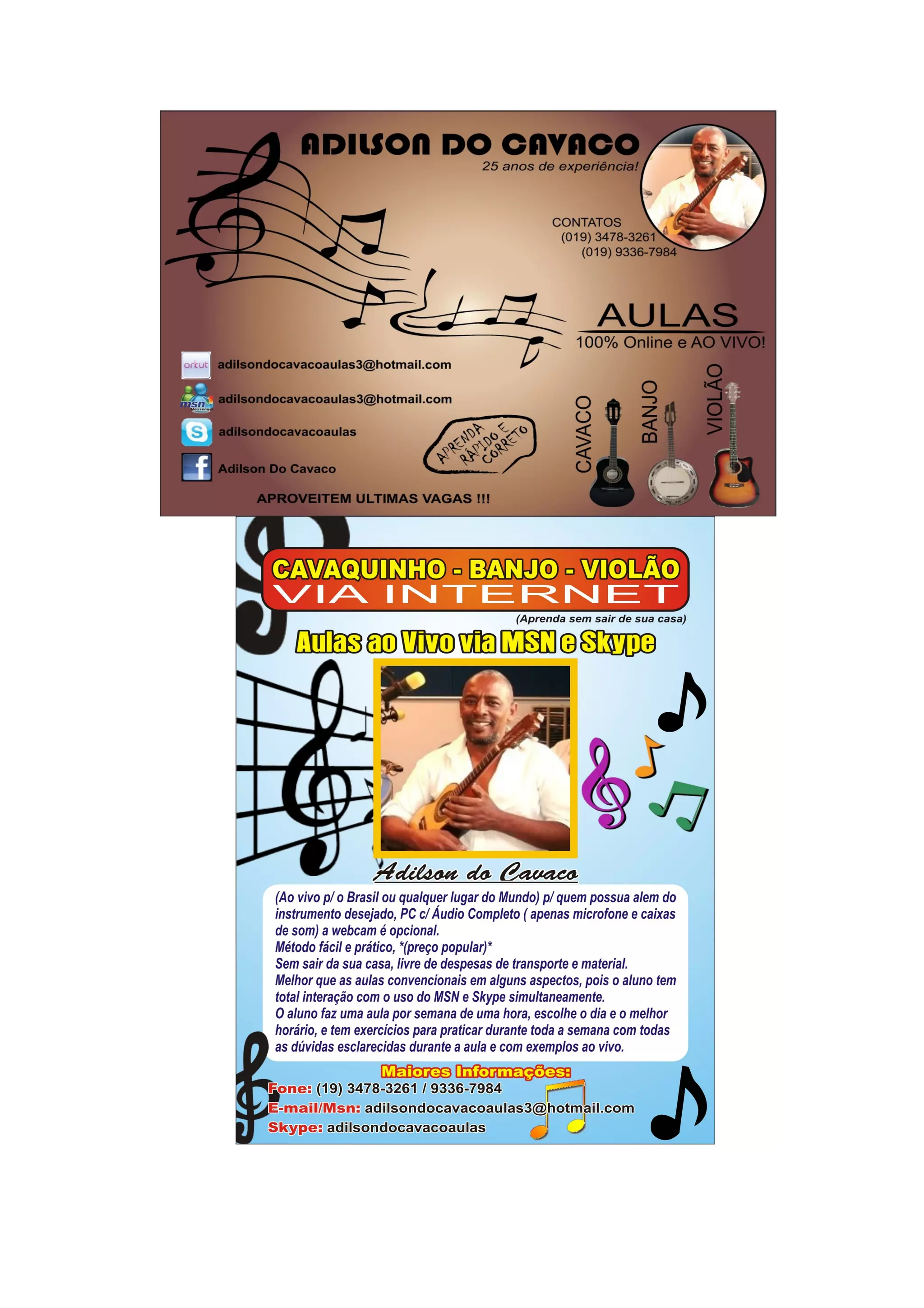 O documento descreve testemunhos de alunos sobre as aulas de cavaquinho, banjo e violão ministradas pelo professor Adilson via internet. Os alunos elogiam o método de ensino, a didática, a paciência e o conhecimento musical do professor. Eles relatam ter melhorado rapidamente e aprendido tanto teoria quanto técnica para tocar o instrumento, mesmo à distância.