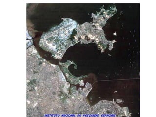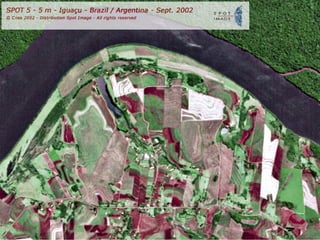 O documento descreve vários satélites de sensoriamento remoto, incluindo LANDSAT, SPOT, IKONOS e QuickBird, com resoluções espaciais variando de 1m a 15m. Também apresenta o satélite sino-brasileiro CBERS e aplicações do sensoriamento remoto como monitoramento agrícola, desmatamento e mapeamento.