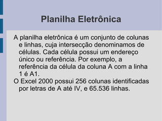 O documento fornece instruções sobre como usar funções e ferramentas básicas no Word e Excel, incluindo editar texto, formatar, inserir tabelas, criar gráficos e classificar dados. Ele também lista atalhos de teclado úteis para cada aplicativo.