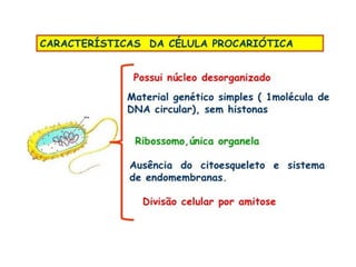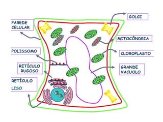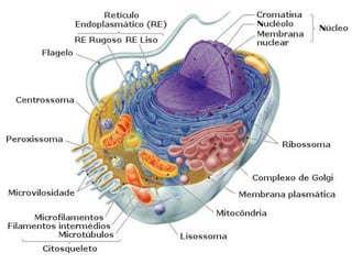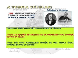 O documento discute a citologia, a história do estudo das células e a teoria celular. Explica que todos os seres vivos são constituídos por células, que o metabolismo ocorre no nível celular e que todas as células possuem material genético. Descreve também as principais estruturas e organelas das células, incluindo a membrana, citoplasma, núcleo e organelas como mitocôndrias e retículo endoplasmático.