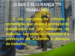 O documento discute o conceito e histórico da segurança do trabalho no Brasil, definindo-a como um conjunto de ciências que visam proteger os trabalhadores e prevenir acidentes e doenças. Apresenta as principais normas regulamentadoras da área ao longo do tempo e classifica os tipos de acidentes e suas causas.
