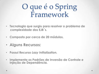 O Spring resolve problemas de complexidade dos EJB's e possui 20 módulos, implementando os padrões de Inversão de Controle e Injeção de Dependência. A estrutura do Spring inclui Core Container, AOP, integração a bancos de dados e web como MVC. O Spring traz alto ganho de produtividade ao desenvolvedor ao se encarregar de detalhes técnicos.