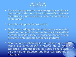 A aura humana é uma manifestação energética que envolve e reflete o estado físico, emocional e espiritual de uma pessoa. Ela é composta de várias camadas que podem ser observadas por sensitivos e fotografadas. A cor e forma da aura fornecem informações sobre a saúde, personalidade e nível evolutivo de um indivíduo.