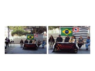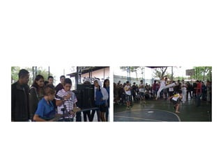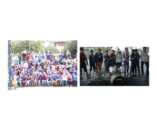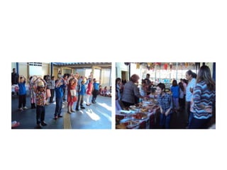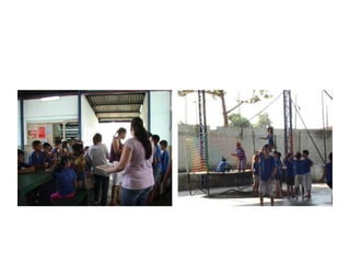O documento lista eventos realizados na escola ao longo do ano letivo, incluindo visitas, festividades como Carnaval e Páscoa, programações como Proerd e projetos com animais. Os alunos do ciclo I têm a oportunidade de brincar em brinquedos diferentes durante a Festa das Crianças, enquanto a Festa Junina e o Show de Talentos promovem a participação de estudantes e professores.
