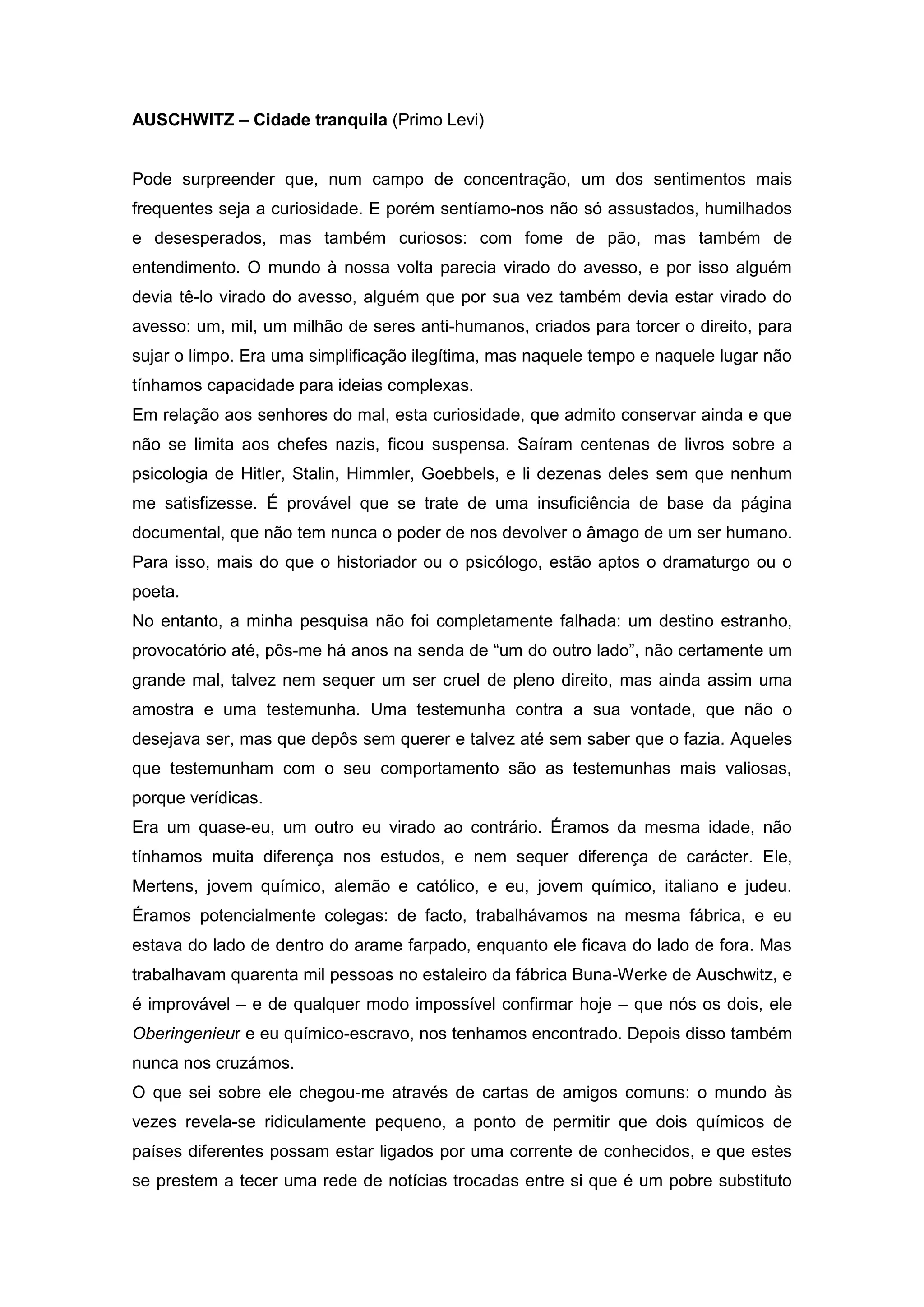 Este documento descreve a história de Mertens, um químico alemão que aceitou trabalhar na fábrica Buna-Werke em Auschwitz para escapar aos bombardeios. Apesar de ver os prisioneiros do campo de concentração, Mertens nunca falou com eles por medo de represálias. Anos depois, admitiu que a sua obediência ajudou o regime nazi, mas que na época não percebia as consequências dos seus atos.