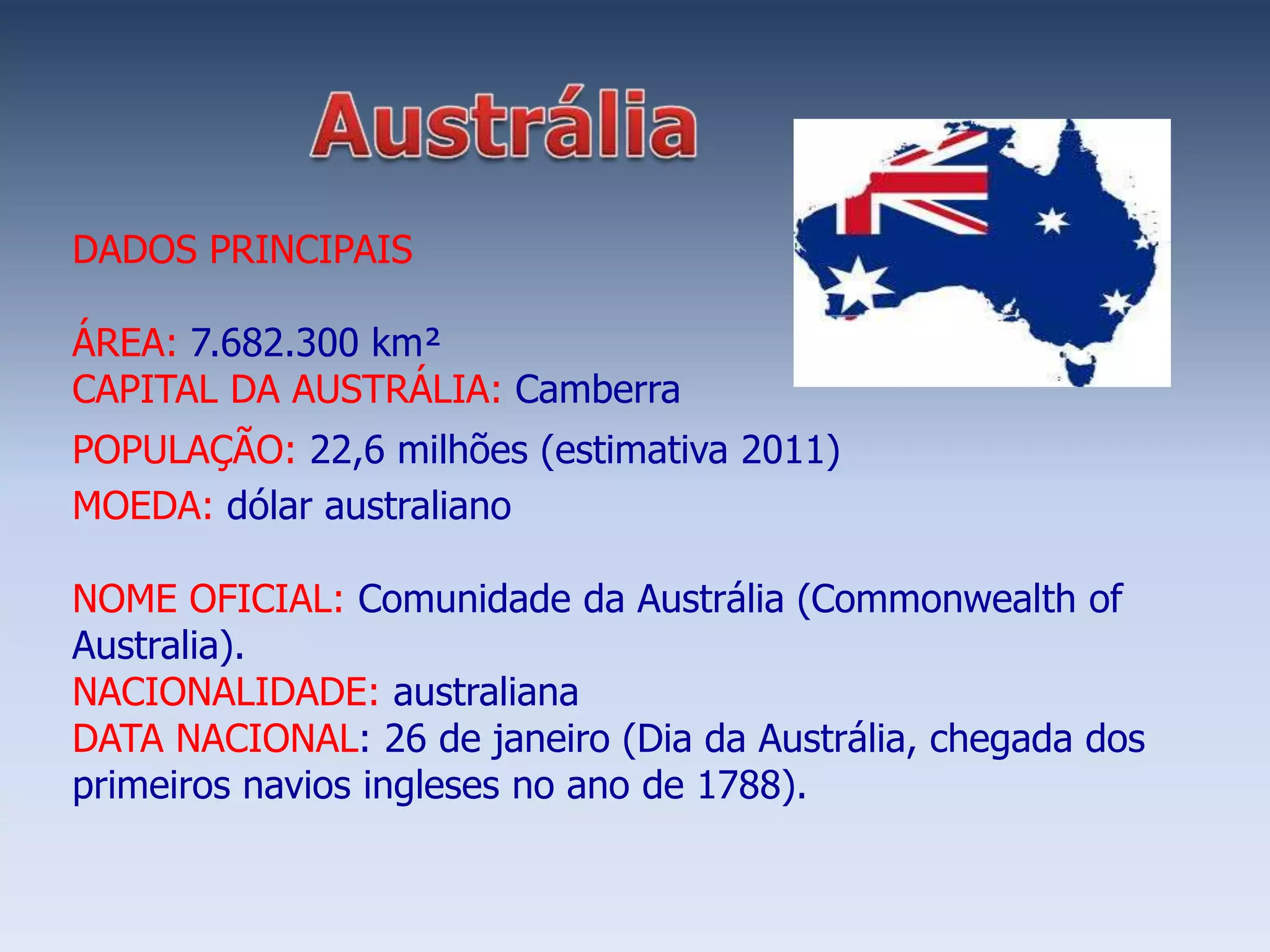 1) A Austrália é uma ilha-continente localizada no sudoeste da Oceania, com área de 7,6 milhões de km2 e população de cerca de 22,6 milhões de habitantes.