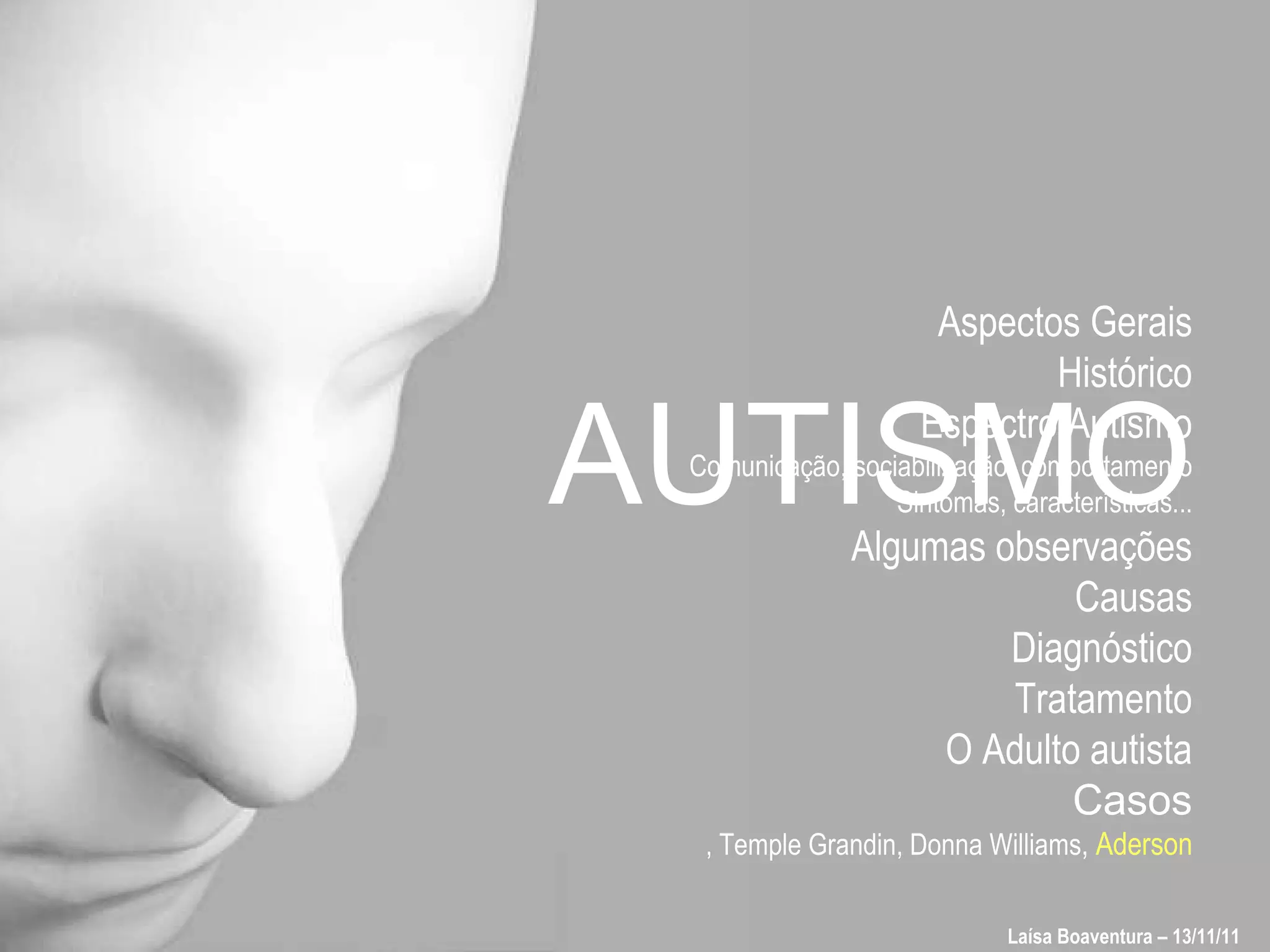 O documento fornece um resumo sobre autismo, abordando seus aspectos gerais, histórico, sintomas, causas, diagnóstico e tratamento. Discute as dificuldades na comunicação, sociabilização e comportamento das pessoas no espectro autista, assim como perspectivas espirituais sobre as possíveis causas do transtorno.