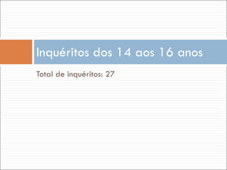 O documento apresenta estatísticas sobre autismo divididas em duas seções: a primeira seção contém dados de 27 inquéritos com pessoas de 14 a 16 anos e a segunda seção contém dados de 33 inquéritos com pessoas de 16 a 24 anos.
