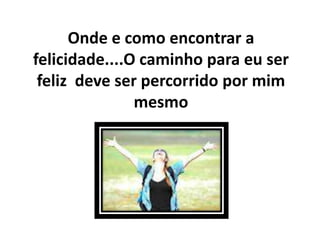 O documento discute como encontrar a felicidade através do autoconhecimento e do amor próprio. Ele enfatiza a importância de se conectar consigo mesmo, de descobrir a interioridade que falta e de viver de acordo com a consciência para alcançar um estado de plenitude.