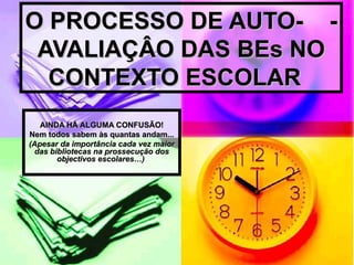 O documento discute o processo de autoavaliação das bibliotecas escolares no contexto escolar. A autoavaliação é importante para identificar pontos fortes e áreas de melhoria da biblioteca e seu impacto no ensino e aprendizagem. O documento explica os quatro domínios de avaliação e como a autoavaliação deve envolver toda a escola para ser efetiva.