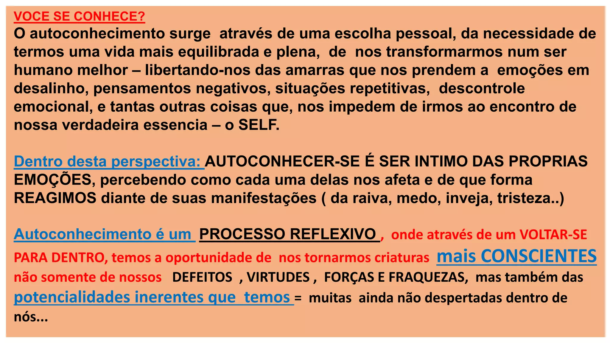 O autoconhecimento é um processo essencial para o desenvolvimento pessoal, permitindo a identificação de emoções, reações e padrões repetitivos que impactam nossas vidas. Através da auto-observação e reflexão, somos desafiados a confrontar nossas verdades internas e a buscar uma compreensão mais profunda de nós mesmos. O caminho para o autoconhecimento pode ser difícil, mas é fundamental para promover mudanças significativas em nosso comportamento e vida emocional.