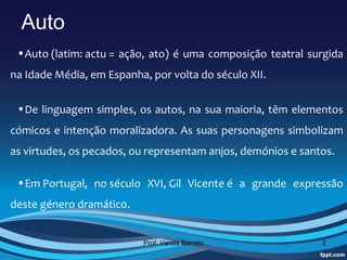 O documento resume o Auto da Barca do Inferno de Gil Vicente. Apresenta o gênero teatral "auto", contextualizando sua origem na Idade Média. Explica que a obra de Gil Vicente critica os costumes da sociedade portuguesa do século XVI através de diálogo entre personagens alegóricas e personagens-tipo que representam classes sociais. Detalha também os elementos cômicos presentes na obra, como o cômico de linguagem e de situação.
