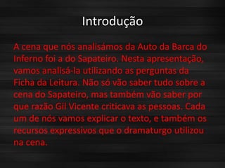 O Sapateiro apresenta-se carregado de formas de sapatos, simbolizando sua profissão e pecados. Ele questiona por que vai para o Inferno se era religioso, mas o Diabo e Anjo revelam que ele era desonesto em sua profissão e vida. Sua tentativa de argumentar sua inocência falha e ele é condenado à Barca do Inferno.